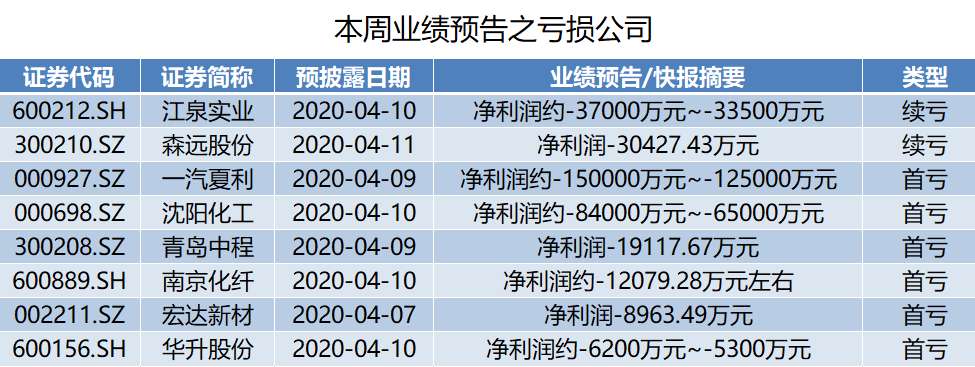 本周至少有8家公司将披露亏损的业绩报告。其中江泉实业(600212.SH)、森远股份(300210.SZ)为续亏,一汽夏利(000927.SZ)、沈阳化工(000698.SZ)、青岛中程(300208.SZ)、南京化纤(600889.SH)、宏达新材(002211.SZ)、华升股份(600156.SH)为首亏。