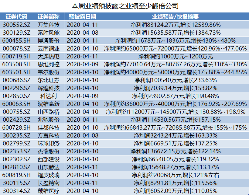 本周年报最大的看点便是2019年年报“增长王”——万集科技(300552.SZ)将披露业绩。此外,剔除扭亏公司,本周将披露年报的公司中预计净利润增长至少翻倍的公司共有22家。