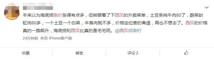 “何止海底捞,普遍都涨了。”无独有偶,同样身为明星企业的西贝莜面村近日也被眼尖的网友发现涨价了,甚至比海底捞涨幅更大。“本来以为海底捞涨价涨得有点多,转眼看了下西贝的外卖菜单,土豆条炖牛肉80了,酸菜封缸肉80多,海底捞和西贝比真的是毛毛雨。”