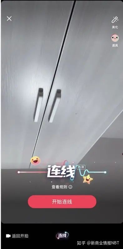 新商业情报NBT近日发现,抖音正在内测连线功能,点击连线,就能够随机匹配一位其他用户进行实时的视频聊天。此外抖音也在低栏增加了熟人板块,来提高好友页面的权重。