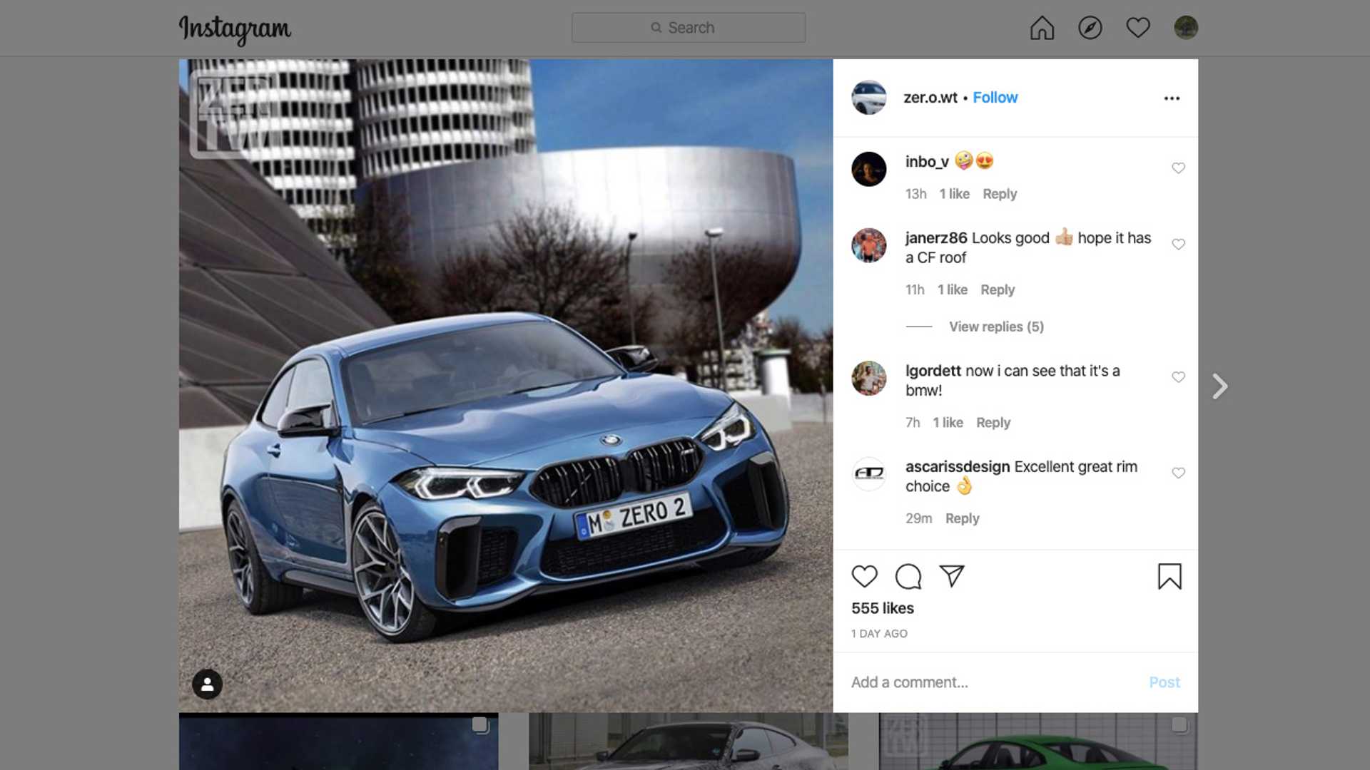 最近,名为“zer.o.wt”的网友,就在社交媒体上公布了他亲手绘制的“G87” 样貌。从成品来看,这位网友的绘画思路受到了不少宝马全新设计语言与风格的影响:与2系Gran Coupe一衣带水的超大尺寸的双肾进气格栅,让人联想起1M的前保险杠造型,以及刀锋形态的冷却进气口。尽管宝马集团尚未正式公布,但“G87” 与下一代M3/M4外形设计神似的事实,不容忽视。