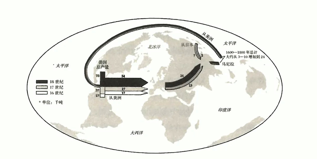中国的生产和人口增长得益于美洲和日本白银的进口。在1800年之前的两个半世纪里,中国总共获得了约6万吨白银,占全世界有记录的白银产量的一半左右。最终明代政府终于逐步承认了白银的地位,并延续至19世纪中叶。