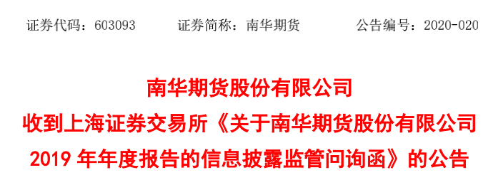 4月7日,南华期货(603093.SH)公告称,收到上交所《关于南华期货股份有限公司2019年年度报告的信息披露监管问询函》。问询函中,上交所要求南华期货说明公司2019年增收不增利及四季度业绩出现亏损的原因。