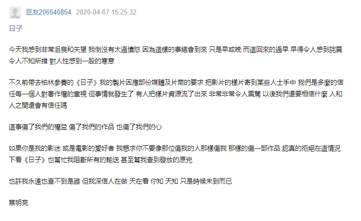 4月7日,导演蔡明亮在其导演的电影《日子》豆瓣条目下发文,称在2020年柏林国际电影节期间,他曾应部分媒体和片商的要求,把《日子》的样片寄予专业人士手中,不料却有人泄露片源。蔡明亮表示自己“感到非常失望和沮丧”,并恳请影迷和电影爱好者停止传播盗版片源,帮助他“查到元凶”。