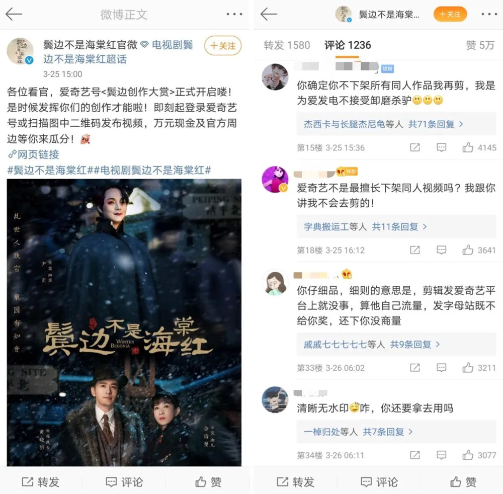 这是3月25日爱奇艺号发起的“鬓边创作大赏”活动,旨在鼓励剪刀手发挥各自的才能,创作更多同人作品,是一种官方借助粉丝力量宣传的手段。剪刀手作为粉丝追剧,本身有产出积极性,官方能收获高质量的安利视频,原本是一件双赢的事。