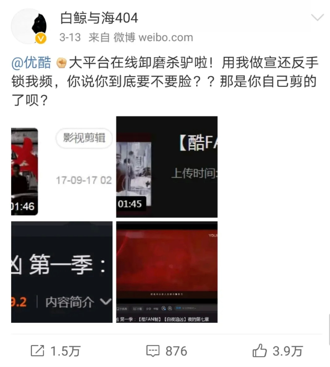 3月13日,微博用户“白鲸与海404”收到B站的站内消息,自己《白夜追凶》的相关投稿被优酷要求下架的消息。不但如此,他还发现被下架的视频直接被优酷当作官方作品上传到优酷平台。虽然标题中出现了“酷FAN(饭)制”字样,但同时注明了“优酷出品”。