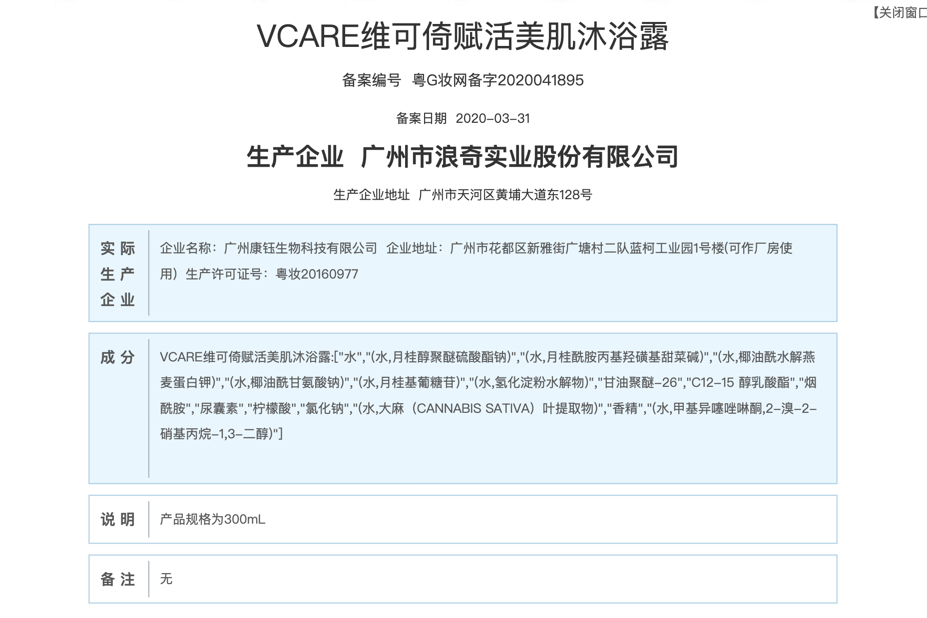同年11月,广州浪奇又发公告称,公司确定将含大麻叶提取物的洗手液、沐浴液、护肤品等产品列入新产品研发计划。截至目前,在国家药监局国产非特殊用途化妆品备案系统上可以看到,上述正在预售的VCARE维可倚沐浴露和洗手液已取得了备案通过。
