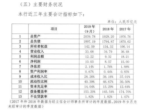 数据显示,截至2019年9月末,威海银行总资产2039.78亿元,资本充足率14.04%。营业收入33.68亿元,净利润10.03亿元。拨备覆盖率153.2%,不良贷款率1.82%。