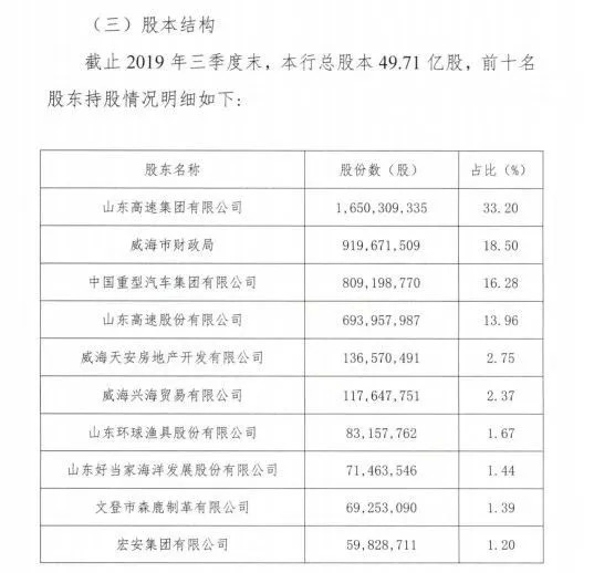 截至2019年三季度末,山东高速集团有限公司持有威海银行的股份占比为33.20%,位列第一大股东;威海市财政局、中国重型汽车集团有限公司持股比例分别为18.50%、16.28%,排名第二、第三;山东高速股份有限公司持股比例为13.96%,位列第四大股东;第五大股东及排名其后的股东,持股比例相对较少,均不足3%。