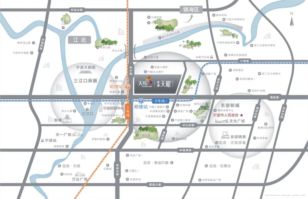 项目的东西南北,分别是东部新城、三江口、鄞州中心区、镇海新城,呈现出众星拱月的姿态。更重要的是,相比单地铁的新世界,龙湖天曜更是一个双地铁(规划)上盖的超级TOD!