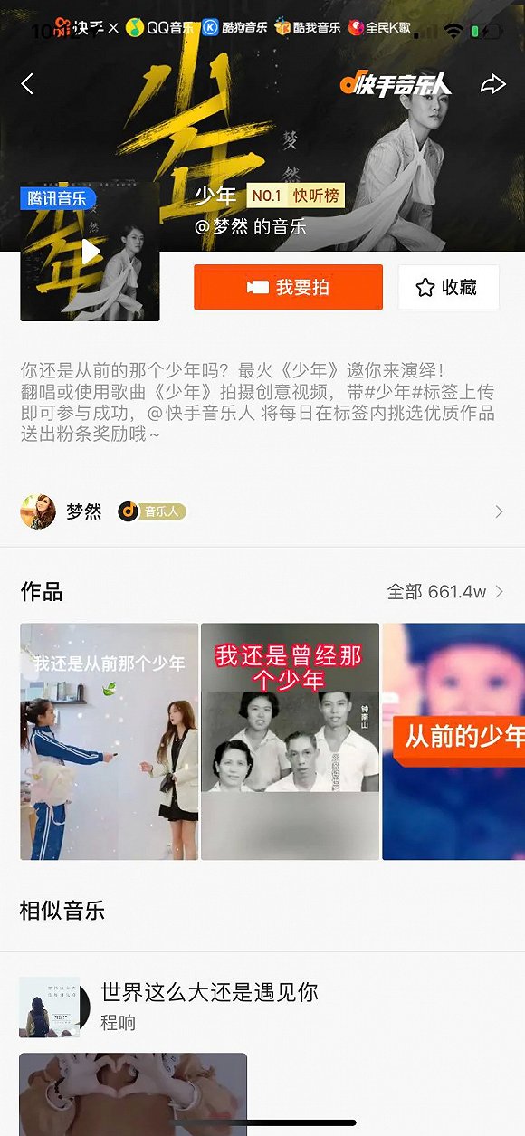 硬糖君综合比较下,《少年》在不同平台创下傲人战绩,其中快手数据最好。#少年-梦然#标签页里,投稿作品多达661.6万。截至发稿,《少年》已经登顶快听音乐榜数日,热度盖过了《桥边姑娘》《下山》等流行作品。