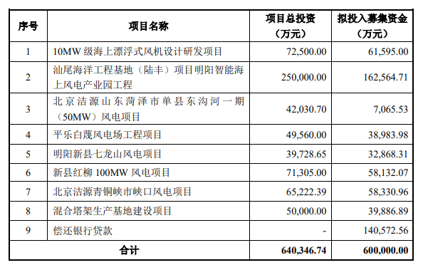 明阳智能(601615.SH)4月8日晚间披露非公开发行股票预案,公司拟通过非公开发行股票募集资金总额不超过60亿元(含),扣除发行费用后用于10MW级海上漂浮式风机设计研发等8个项目,以及偿还银行贷款。