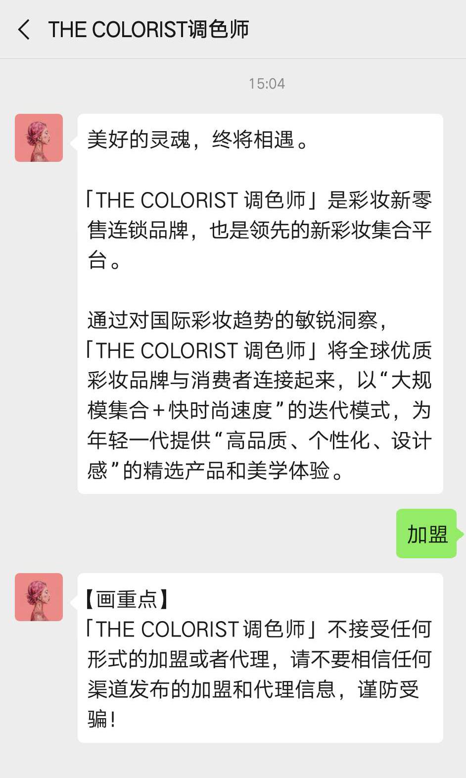 对此,小C在其THE COLORIST调色师官方微信公众号上留言加盟相关事宜,其回复为“「THE COLORIST调色师」不接受任何形式的加盟或者代理,请不要相信任何渠道发布的加盟和代理信息,谨防受骗”。