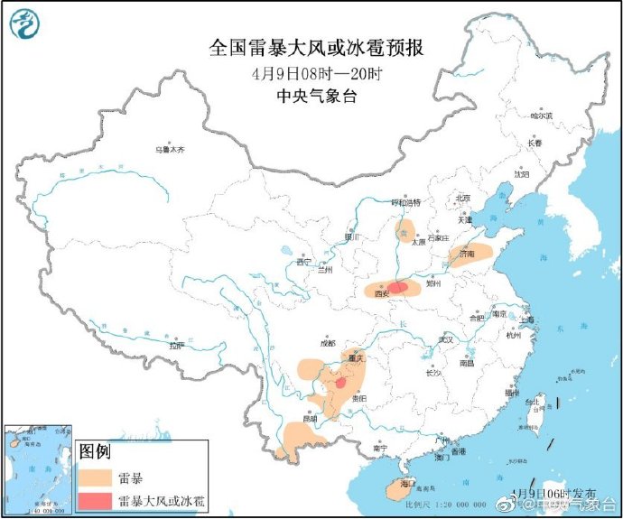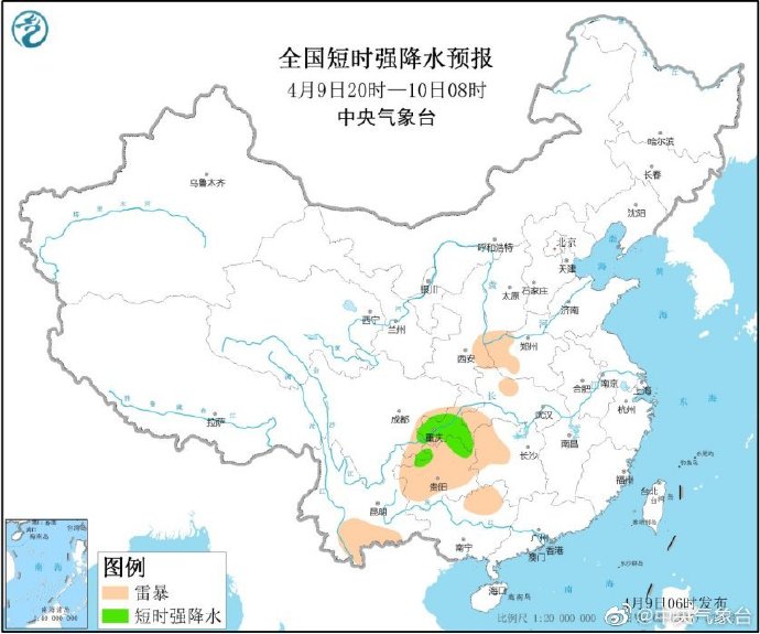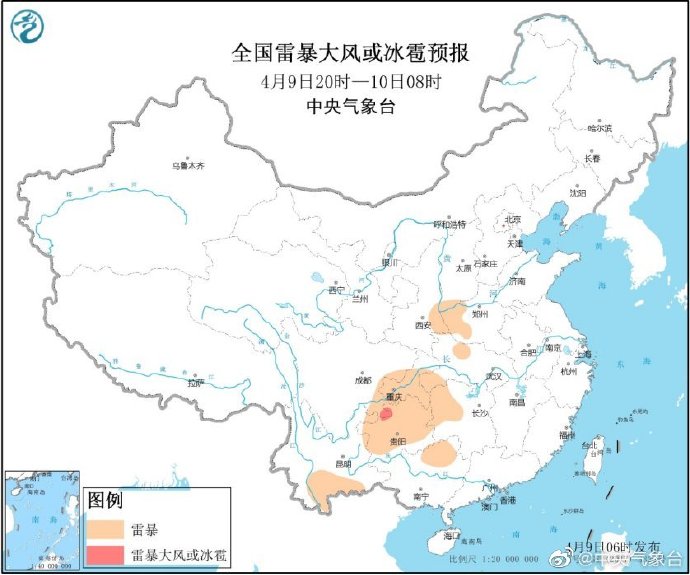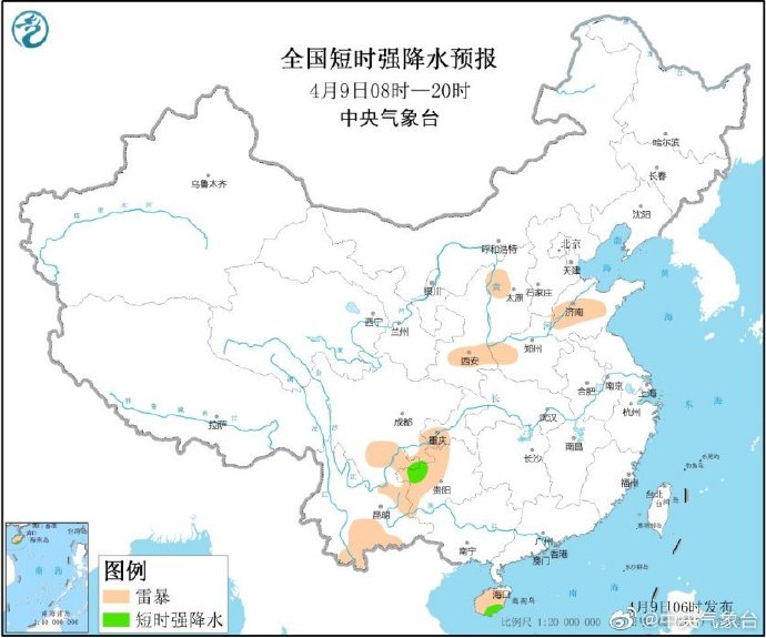 据中央气象台微博消息,4月9日,四川盆地东南部、重庆中南部、贵州北部、海南岛南部等地的部分地区将有短时强降水天气,小时雨强20-40毫米;另外,陕西东南部、河南西部、四川盆地东南部、贵州西北部等地的局地将有雷暴大风或冰雹天气。