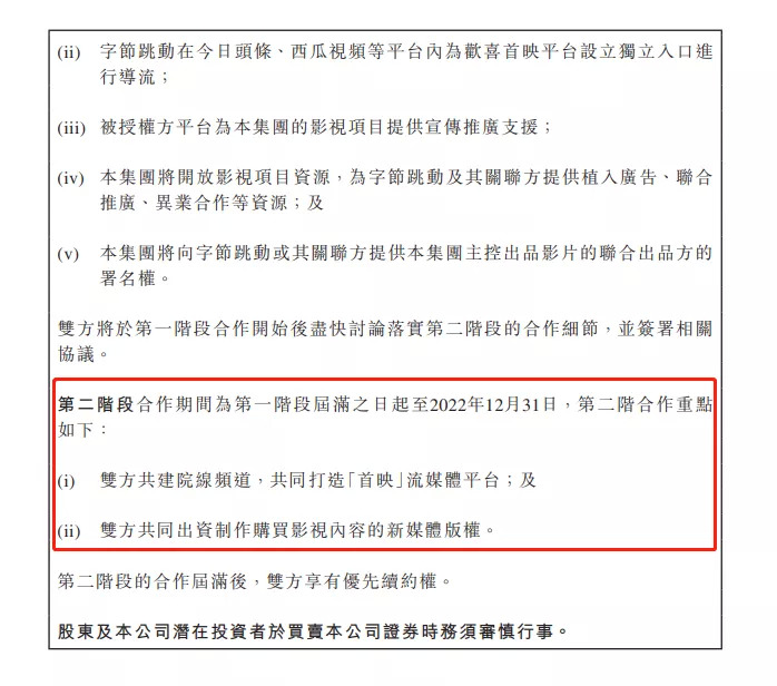 更重要的是,在第一阶段合作期届满之日起至2022年12月31日,双方将共同出资制作购买影视内容的新媒体版权及共建院线频道,共同打造“首映”流媒体平台,合力共建中国领先的长视频平台。