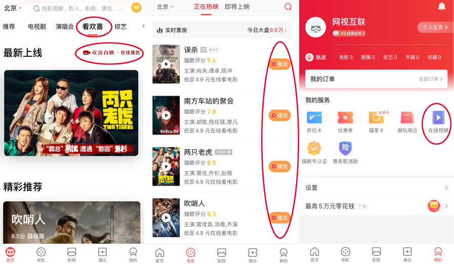 “网视互联”发现,在猫眼app上,欢喜首映的入口可谓无处不在。app首页、电影频道、用户信息页均有明显的观影入口和导流通道。