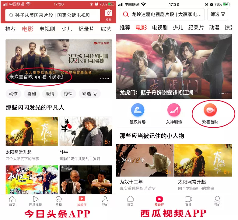 近日,欢喜首映不少独家影片开始在字节跳动旗下“今日头条”“西瓜视频”等平台同时播放,而今日头条、西瓜视频APP内,也为“欢喜首映”平台设立了独立入口及专区进行导流。