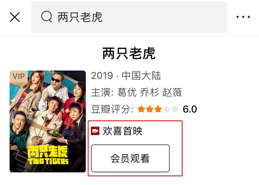 不仅设立了独立入口,目前在“今日头条”搜索《误杀》《两只老虎》等欢喜首映独家影片,将直接导流到“欢喜首映”进行观看,而今日头条将共享由长视频带来的付费播放收益分成。