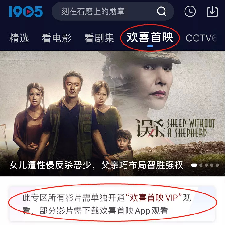 此外,欢喜传媒还跟CCTV-6旗下的1905电影网合作,在1905电影网app和PAD客户端建立了“欢喜首映”联合运营专区。“欢喜首映”频道权重甚至排在了CCTV6的前面。