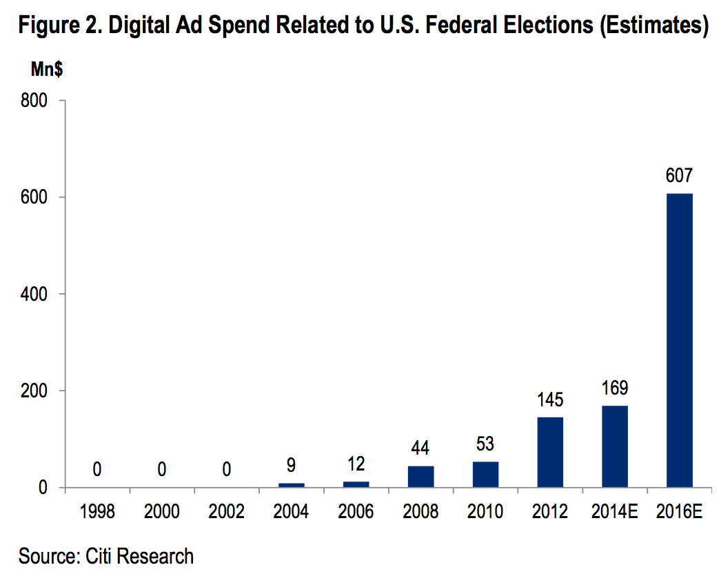 “在我们和业内人士的沟通中,一个反复被提及的主题就是,Faccebook和谷歌将会在2016年大选期间成为最大的数字广告投放平台。”花旗集团的Mark May和Jason Bazinet表示。