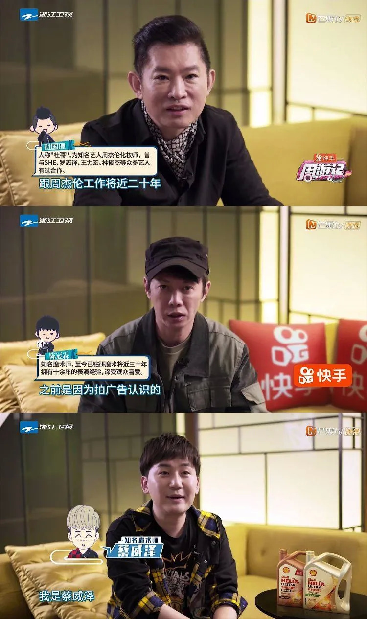 人称“杜哥”的杜国璋,是周杰伦的御用化妆师,也是《听爸爸的话》的MV导演,从2000年起就开始在周董身边工作了;周杰伦喜欢魔术,因而结识了魔术师蔡威泽和陈冠霖,前者曾经登上过《美国达人秀》,并在2018年春晚和周杰伦一起表演了节目《告白气球》,而后者则曾在周杰伦的《魔杰座》等多个作品的MV中担任过魔术指导。