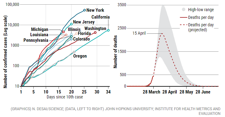 病例数呈指数上升(截至3月30日,左图)表明在某些州爆发疫情,而建模(右图)表明美国的死亡人数将很大。
