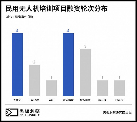 从轮次分布上来看,天使轮融资和定向增发事件最多,均为4起。股权融资其次,为3起。无人机培训行业出现不足十年,融资轮次整体靠前。多数无人机培训暂无融资。据AOPA数据显示,2014年至2018年我国正规的无人机驾驶员训练机构由18个增至337个。其中,华北、中南、华东、东北、西南地区的无人机培训机构均是5年前的10倍以上。