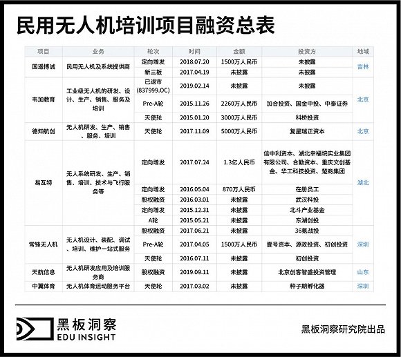 相比于无人机制造行业来说,无人机培训赛道内融资较少。互联网上披露的几家融资也多是集无人机研发、生产、销售、服务、培训为一体的项目。目前,单纯进行无人机培训行业的企业融资仅有一家,占比14.29%。