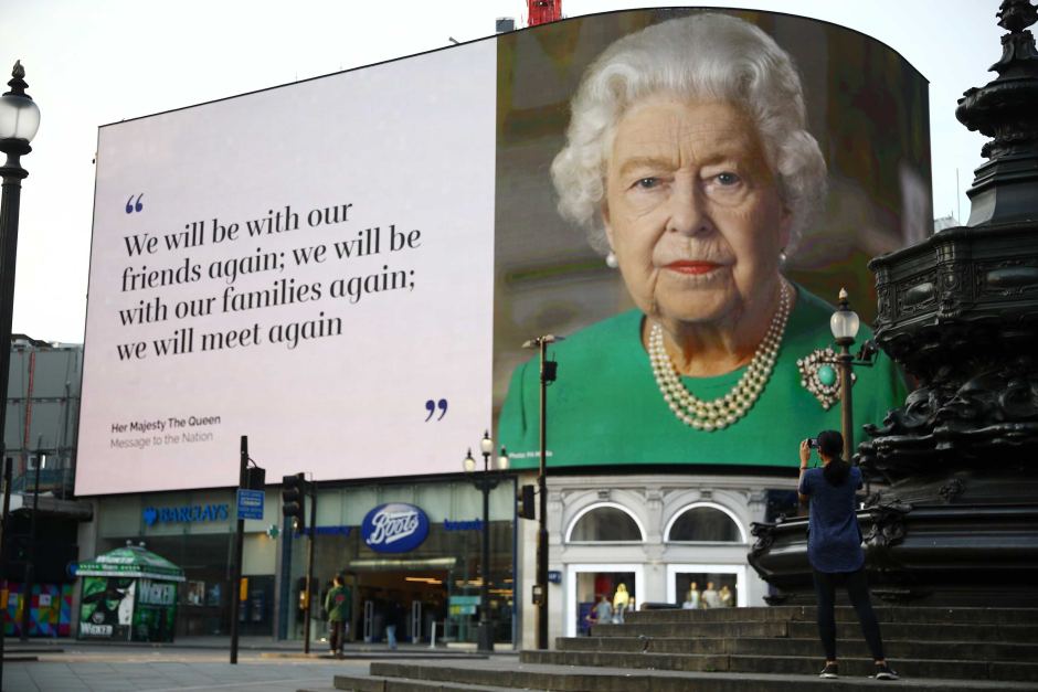 位于伦敦市中心的皮卡迪利广场是英国热门地标景点之一,随着新冠肺炎疫情在英国蔓延,这里的巨幅LED显示屏近日换上了伊丽莎白二世女王的头像,同时还附上了女王在5日演讲中的几句话,“我们将与好友重聚;我们将再次与家人相伴;我们定能重逢”“我要感谢奋战在英国国民医疗服务体系一线的抗疫人员,还有那些护理工作者和坚守关键工作岗位的人员”“我们应该感到安慰,尽管还要忍受很多苦难,但美好的日子终会回来”。