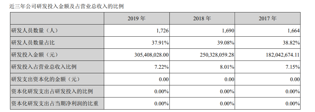 公司研发资金和人员的投入也进一步提升,2019年,公司研发人员数量为1726人,研发投入金额为3.05亿元,皆是近三年最高。