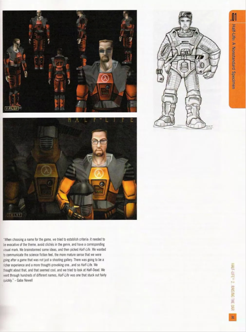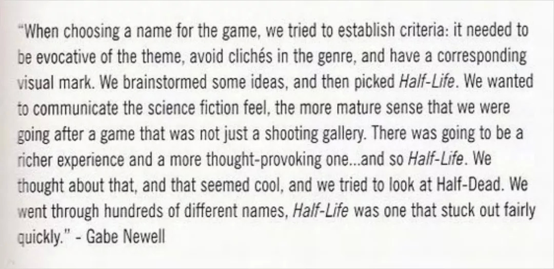 “在为游戏选择名称时,我们试图建立一个标准:它需要契合主题、避免陈词滥调,并且令人印象深刻。我们集思广益,然后选择了‘Half-Life’这个名字。我们想要传达一种科幻感,一种更成熟的感觉,而不仅仅是追求一场射击大赛,它应该有更丰富的体验和更发人深省的东西……所以,就是‘Half-Life’了。我们思来想去,觉得很酷,我们也试过‘Half-Dead’行不行。(其实)我们考虑了上百个不同的名字,但‘Half-Life’是很快就蹦出来的那一个。”