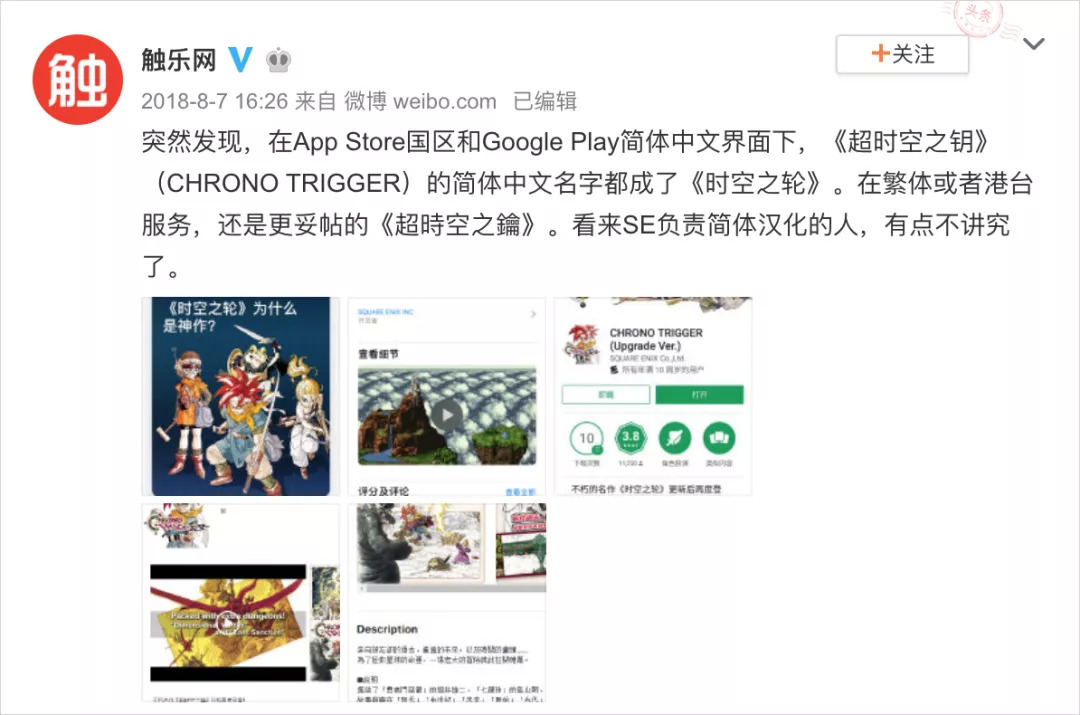 本来,今天的史克威尔艾尼克斯已经正本清源,在《Chrono Trigger》推出手机版时把官方游戏名定为《超时空之钥》,但是有一天,当玩家打开App Store或Google Play,忽然发现它的繁体版名字维持不变,简体中文版名改成了《时空之轮》……