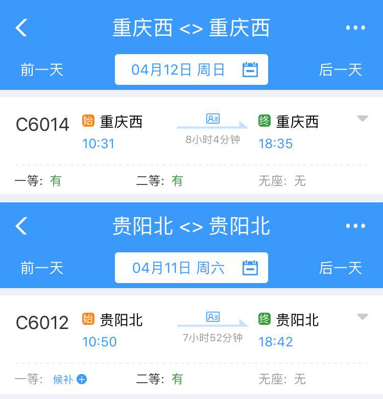 今天(4月10日)早上8点10分,C6017次列车从成都东站发出,在途径重庆西、贵阳北之后,将于下午16点19分重新回到成都东站。这是中国铁路成都局集团有限公司(下称成都局集团)开行的环形动车线。