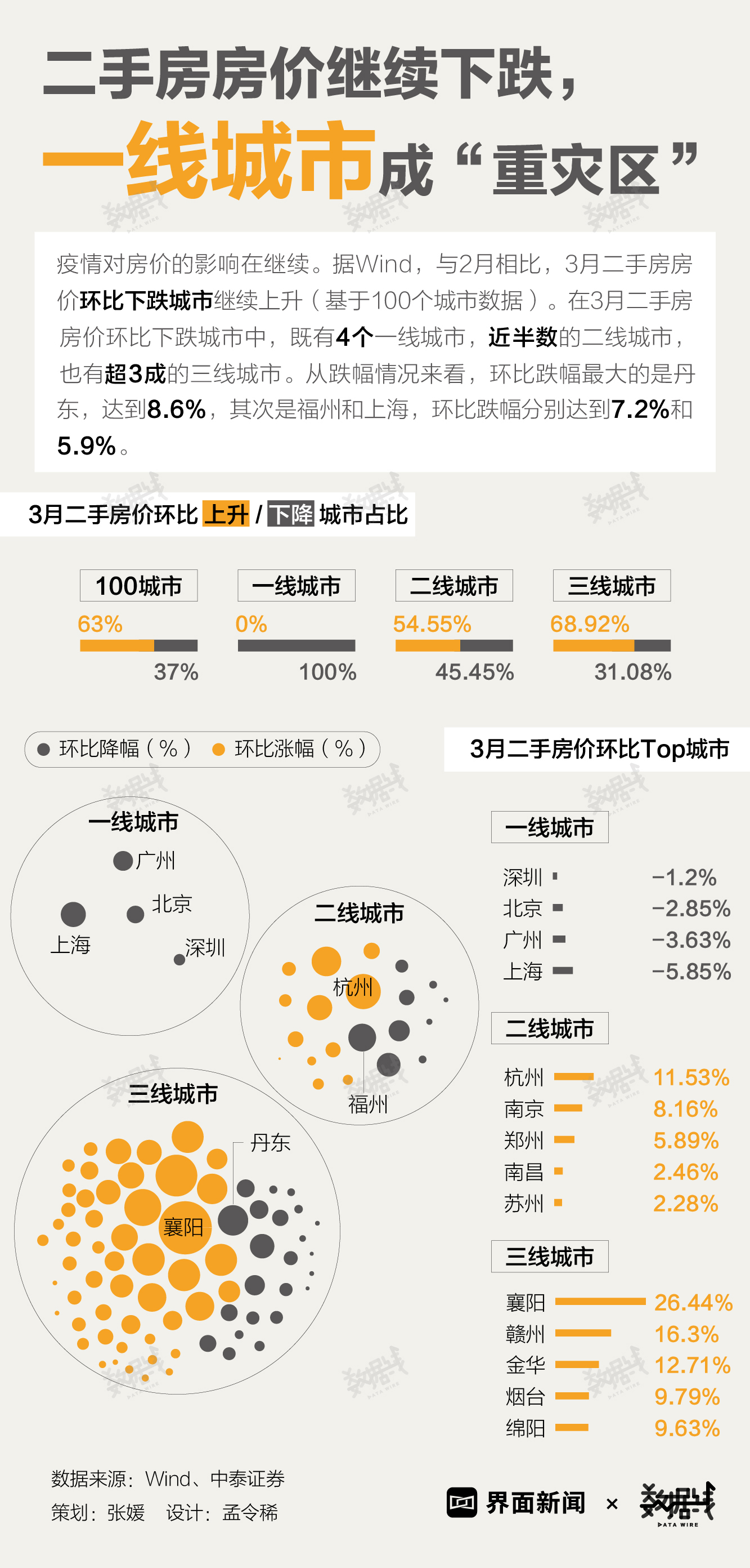疫情对房价的影响在继续。据Wind,与2月相比,3月二手房房价环比下跌城市继续上升(基于100个城市数据)。在3月二手房房价环比下跌城市中,既有4个一线城市,近半数的二线城市,也有超3成的三线城市。从跌幅情况来看,环比跌幅最大的是丹东,达到8.6%,其次是福州和上海,环比跌幅分别达到7.2%和5.9%。