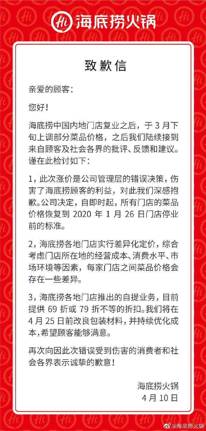 4月10日下午,海底捞在官方微博上发布了一封致歉信,表示:“海底捞门店此次涨价是公司管理层的错误决策,伤害了海底捞顾客的利益。对此海底捞深感抱歉。自即时起,中国内地门店菜品价格恢复到今年1月26日门店停业前标准。”