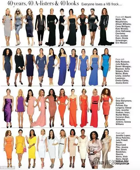 在去年维多利亚40岁生日之际,《Glamour》杂志邀请到40位一线明星演绎了40套不同的维多利亚设计的服装为我们的时尚女王维多利亚庆生,要知道这个阵容包括碧昂斯、詹妮弗·洛佩兹、卡梅隆•迪亚兹、奥普拉•温弗瑞和金•卡戴珊在内的一众星光熠熠明星都穿上了维多利亚•贝克汉姆牌的女装,并在服装的衬托下更显完美。