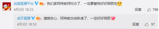 一些大主播很快找到了下家。在《英雄联盟》主播中颇有名气的文森特,3月底最后一天直播时还哽咽落泪,直言不舍,但四天后便官宣签约虎牙。在他官宣的微博中,战旗和虎牙的官博还前所未有地进行了一番互动。