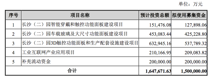募投项目中,公司预计,长沙(二)园智能穿戴和触控功能面板建设项目 投资总额达15.15亿元,项目建设周期为24个月,项目全部建成达产后,将实现年产智能穿戴设备零组件900万个,项目全部达产后,蓝思科技科技预计可实现年销售收入18亿元。