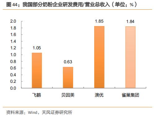 天风证券在其研报中指出,飞鹤整体科研投入较少,研发能力也与国际品牌有一定差距。飞鹤及其他国产品牌未来在产品端存在的进步空间就是提高自身研发实力,研发带来更具价值的产品,产品品质将是核心竞争力。