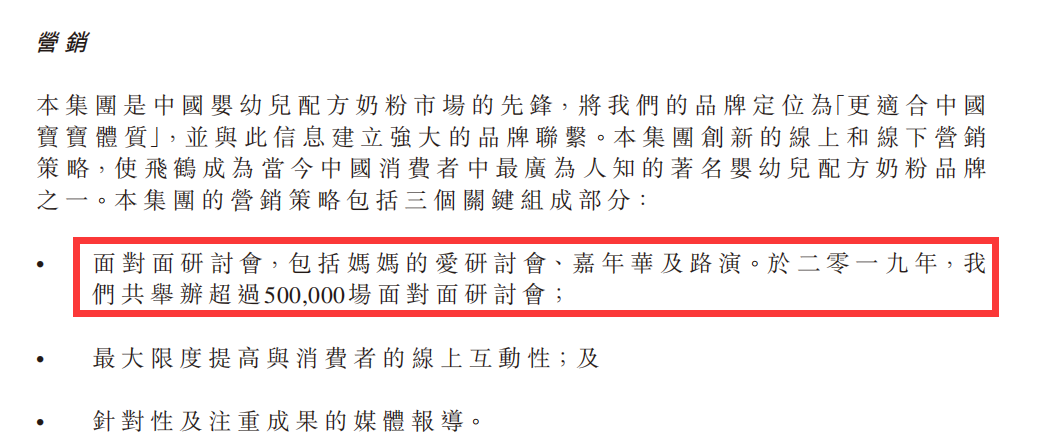此外,飞鹤还热衷搞线下活动。据此前的招股书显示,飞鹤举办的面对面研讨会包括三种形式:一、“妈妈的爱”研讨会,免费向消费者提供有关怀孕和育儿方面的知识;二、在市场份额较低的地区举办嘉年华、小型和大型研讨活动,推广介绍产品;三、销售代表在小型和大型活动的娱乐“秀”休闲区设立摊位,向家长介绍产品等。而最新的财报中称飞鹤2019年全年举办了超50万场线下活动,这样算下来平均每天就有约1370场活动同时开启。