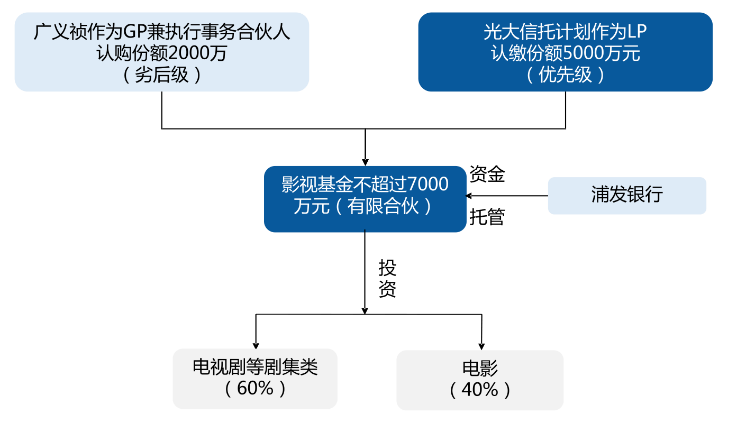 2016年8月,光大信托成立该信托计划,计划实际募集信托本金5000万元,期限为2+1年,预期投资收益为基准收益率8%/年+25%的浮动收益。投向于电影、电视剧等影视产业项目,并主要通过电影、电视剧的发行上映、版权出售等方式实现退出。风控措施方面,拥有广义祯69.75%股权质押,广义祯自有资金出资认购劣后份额,优先劣后比例为2.5:1。