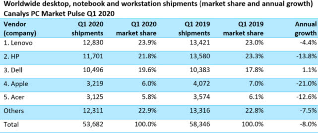 据外媒报道,在世界各地严格执行“封城”措施,促使远程工作和学习激增后,全球对个人电脑(PC)的需求在2020年第一季度飙升。但这场危机也导致生产和物流问题严重延误,最终导致全球PC出货量同比下降8%,苹果Mac更是狂降21%。市场研究机构Canalys发布的最新研究报告称,在2020年第一季度,供应商出货的个人电脑总数为5370万台,而去年第一季度为5830万台。其中,出货量最高的供应商排名保持稳定,联想仍以1280万台的出货量领先于PC市场,下降了4.4%,但市场份额从23%上升到23.9%。