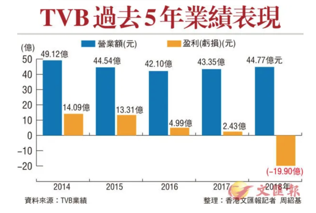 3月25日, TVB公布2019年财报,收入同比减少18%至36.49亿元港币,净利润连续两年亏损,同比扩大48%至2.95亿元港币。