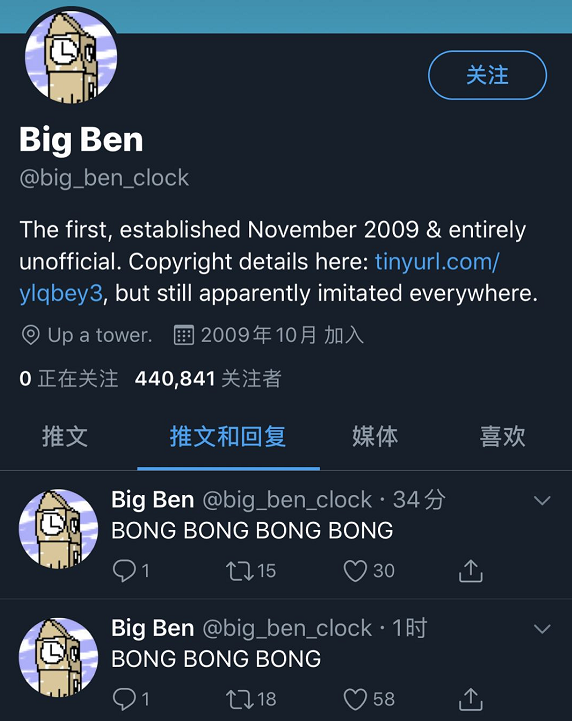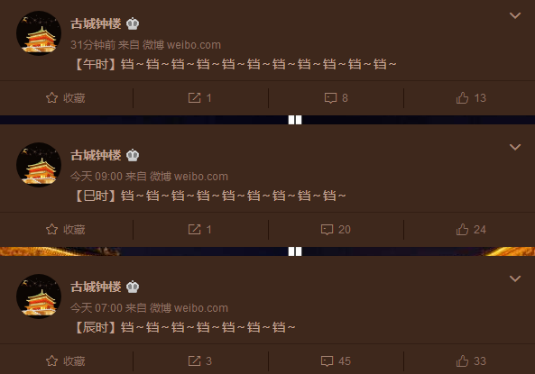 或许是受大本钟Bot的启发,2011年,一个名为“古城钟楼”的账号在微博注册。发布了两条“宏厚的钟声又将响彻云霄”、“爱西安”的打招呼内容后,开始了数年如一日的报时日常。该账号每到整点就会发布一条标注了时辰的“铛~铛~铛~铛~”内容,且从不参与评论区互动。