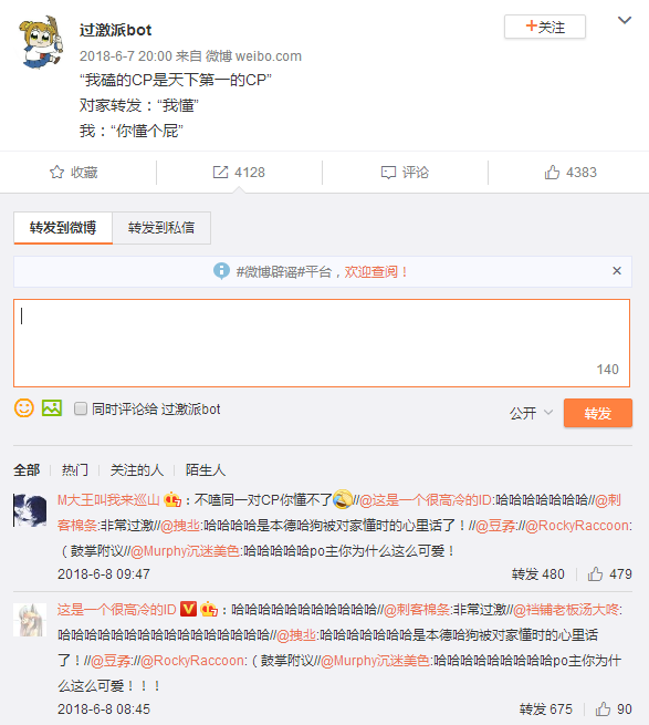 2018年6月,粉丝仅4000人的“过激派Bot”发布的内容在经过@M大王叫我来巡山@这是一个很高冷的ID 等博主转发后,很是火了一把,连同“Bot”概念一起闯入大众视线。