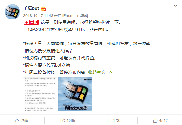 不止如此,Bot这种筛选并发布投稿的模式,更像是一种集合众人力量进行创作的内容众筹。投稿人向Bot提供内容,Bot经过筛选后进行发布,这一过程就像电台时代被展读的优秀读者来信,会给予投稿人极大的满足感及参与感。