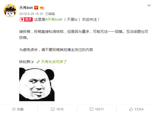 2018年下半年,微博上冒出大量顶着“某某Bot”名头的账号。账号运营者接受用户投稿,并在筛选后通过Bot账号发布,通过众人合力创作账号内容,形成一种内容众筹的模式。