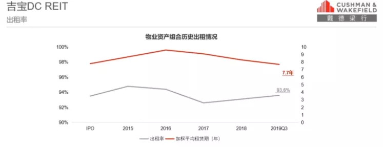 戴德梁行《亚洲房地产投资信托基金REITs研究报告》显示,亚洲市场上有一支专门运营数据中心的房地产投资信托基金,来自新加坡的吉宝DC REIT。旗下运营18个数据中心项目,可租赁面积达13.9万平方米,出租率长期稳定在92%~95%,平均租期达7.7年。