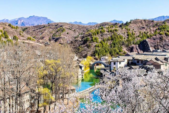 如今,司马台长城的墙壁与山桃花格外相配,随意找一个角度都可以拍出大片即视感。从上往下看鸳鸯湖水库里或许还会有一群白鹅划破水面波纹嬉水玩耍。