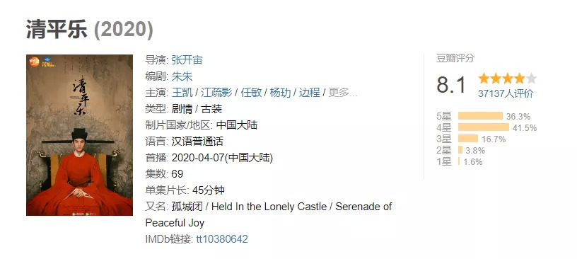 《清平乐》则由王凯、江疏影主演,张开宙执导,以69集的篇幅,讲述了北宋皇帝宋仁宗的一生。这是正午阳光第四部古装题材剧。从豆瓣数据来看,《清平乐》3万7000人打出8.1分,但其开篇的剧情节奏却遭到了质疑,导演张开宙更是首播当天就被骂上了热搜。